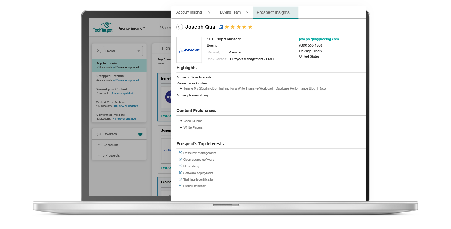 TechTarget takes the guesswork out of outbound prospecting. While cold contact providers can only provide you with a list of personas to try, TechTarget’s Priority Engine automatically identifies active prospects: real people displaying real purchase behaviors in your specific technology category. And IntentMail AI™ makes personalization super easy.